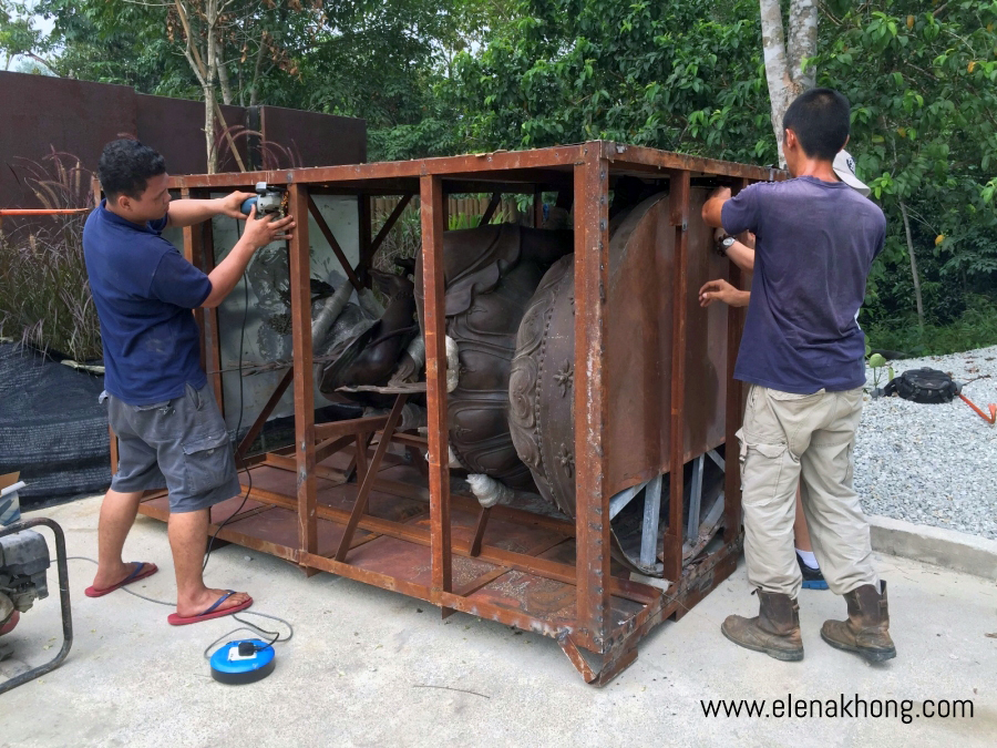 After cleaning the statue, we moved Dream Manjushri to another location so that the crane would have an easier time lifting the whole statue over the electricity poles into the middle of the fish pond